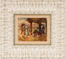 The artist demonstrates considerable skill with meticulous attention to period costume details and facial expressions. The background landscape employs softer techniques, creating atmospheric perspective with misty purple hills receding into the distance. This delightful scene captures the genteel social interactions characteristic of Regency-era society.