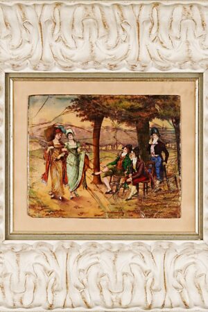 This charming artwork depicts an elegant social encounter from circa 1810–1820. The composition showcases five figures in a pastoral setting beneath tall trees. Two fashionable women in Empire-waist dresses and decorative bonnets appear to meet three gentlemen in formal attire with knee breeches, tailcoats, and bicorn hats. The men are arranged in a relaxed grouping—two seated and one standing—suggesting a casual outdoor gathering of the leisure class.